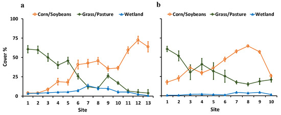 Temporal average proportion of crops (corn plus soybeans), grasslands/pastures, and wetlands for (a) 13 AMSR-pixels study sites transect in ND (2003–2016) and (b) 10 sites in SD (2006–2016). Note the general spatial trend of cropland versus grassland/pasture in both transects. Bars indicate two standard errors (± 2SE) of interannual variation.