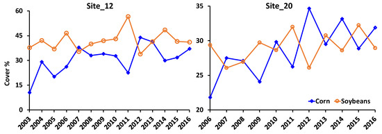 Corn and soybeans cover percentage time series for crop dominated sites in ND (site 12) and SD (site 20). Note the alternating crop rotation pattern. Note also the differences in axis scaling between the sites.