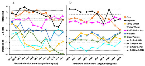 Mann–Kendall trend graphs for (a) ND transect for 2003 to 2016 and (b) SD transect for 2006 to 2016. Graph shows z-score as a function of longitude for seven main CDL cover types. The gray dashed lines present the z-scores at various p-values.