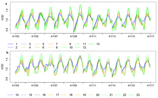 Vegetation optical depth (VOD) time series plots for the AMSR pixel sites of study area transects in: (a) east-central North Dakota, and (b) eastern South Dakota for 2003/06–2016 with DOY 91-305 annual cycles. Lines in the figure were grouped in to three: (1) grass dominated most western study sites with smaller amplitude (blue, 1–3 in ND and 14–16 in SD); (2) mixed grassland/pasture and crop cover middle sites (golden, 4–9 in ND and 17–20 in SD); and (3) crop cover dominated most eastern sites that have larger amplitude (green, 10–13 in ND and 21–23 in SD).