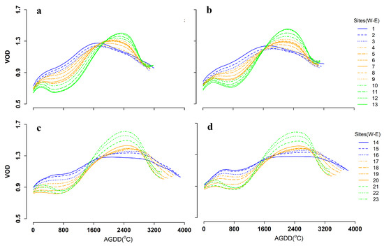 Based on the paired two-sample t-test of the transect means, the means of PHVOD from the two temporal groups (g1 is 2003–2005 plus 2007 and g2 is 2013–2016) in the ND transect were not significantly different from each other (Figure 9a, Table 2). Likewise, in ND, there was no significant difference in TTPVOD between g1 and g2 (Figure 9c, Table 2). In contrast, the PHVOD and TTPVOD in SD were significantly different, with PHVOD being slightly higher in g1 (Figure 9b, Table 2) and TTPVOD being longer in g2 (Figure 9d, Table 2). PHGDD, TTPGDD, and PHV were all significantly different in ND, but the magnitudes are small (Table 2 and Figure S2a,c,e, respectively). In SD, the temporal pairs for each metric were significantly different, but magnitudes were small except for TTPVOD where g2 was several days longer in terms of AGDD than g1 (Table 2, Figure 9d).