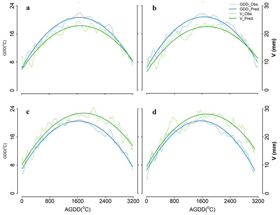 Convex quadratic models for GDD and V for site 1 (a,b) and 13 (c,d) in ND for temporal group averages 2003–2005 plus 2007 (a,c) and 2013–2016 (b,d). GDD and V were fitted for DOY 91 – 330.