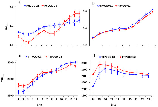 Scatterplots of temporal groups averages (g1: 2003–2005 plus 2007 in blue, and g2: 2013–2016 in red) of peak height of VOD (PHVOD; a,b), and thermal time to peak VOD (TTPVOD; c,d) in ND (a,c) and SD (b,d). Error bars show ±2SE temporal errors. Note the differences in y-axes.