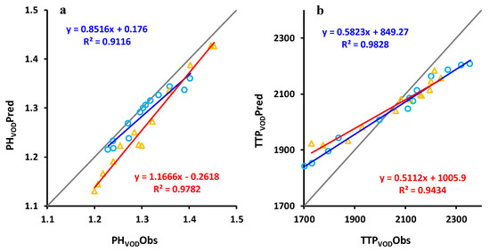 For the ND transect, (a) the Predicted Peak Height VOD (PHVODPred) and (b) the Predicted Thermal Time to Peak VOD (TTPVODPred) each as a function of growing season maximum value determined by the Observed Peak Height VOD (PHVODObs) and Observed Thermal Time to Peak VOD (TTPVODObs), respectively, where blue line with cyan triangles and blue text display g1 (2003–2005 plus 2007) and red line with golden circles and red text display g2 (2013–2016). The SD transect sites exhibited very similar properties (data not shown).