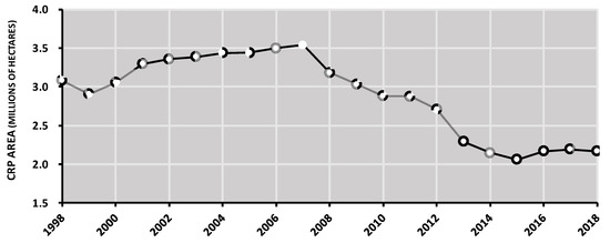 The significant decrement of grassland/pasture and increment of corn/soybean coverage in this study is in line with [8], and the substantial decrease in participation in the Conservation Reserve Program (CRP) since 2008, following peak enrollment in 2007 [7]. Between 2010 and 2013, 30% (more than 530,000 ha) of expiring CRP land parcels were returned to the production of mainly corn and soybeans in the 12-state Midwestern region of the United States that incorporates the US-PPR [8]. Grasslands were the largest type of CRP land converted (68%), followed by specifically designated wildlife habitats [8]. Arora and Wolter [47] findings also revealed that annual grassland loss rate between 1985 and 2011 was 1.5%, while it sky-rocketed to 5.5% in recent years. The statistical data by USDA Farm Service Agency FAS [48]; about total area enrolled in the Conservation Reserve Program (CRP) in four states in the US-PPR illustrates the decline in area enrolled (Figure 11).