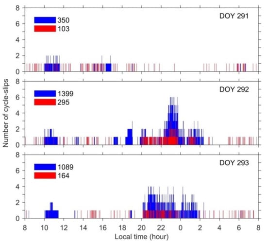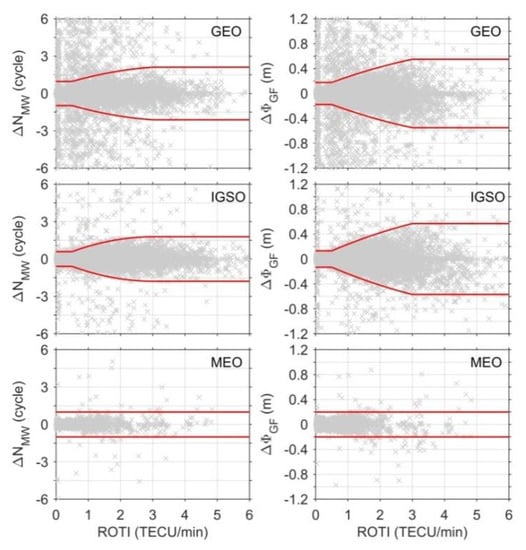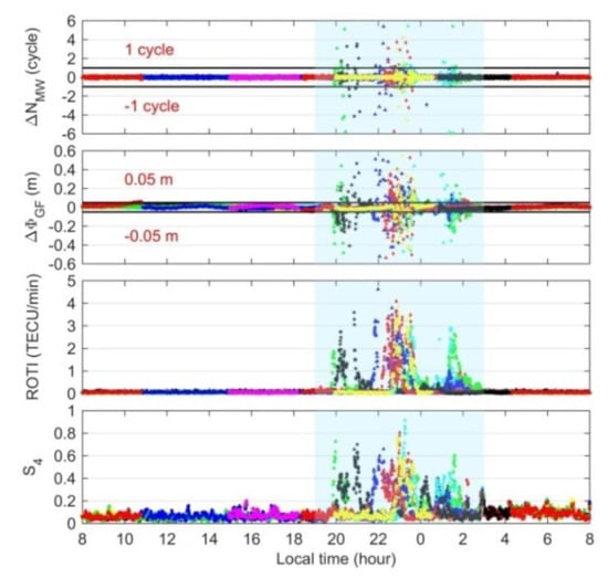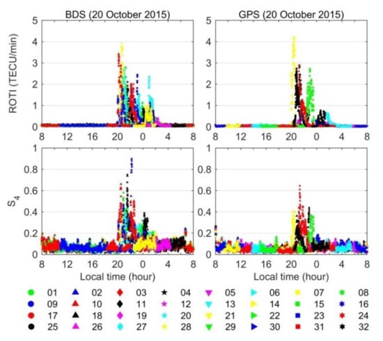 - Liu, Z.; Yang, Z.; Xu, D.; Morton, Y.J. On inconsistent ROTI derived from multiconstellation GNSS measurements of globally distributed GNSS receivers for ionospheric irregularities characterization. Radio Sci. 2019, 54, 215–232. [Google Scholar] [CrossRef]