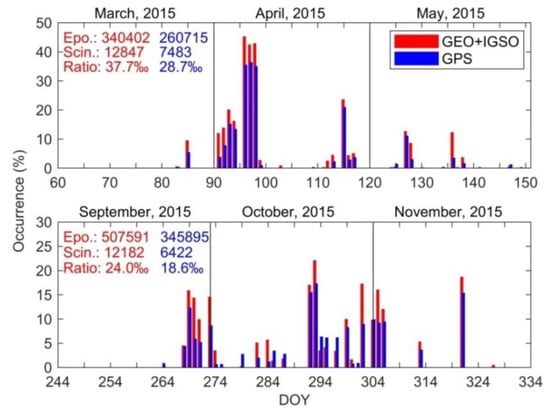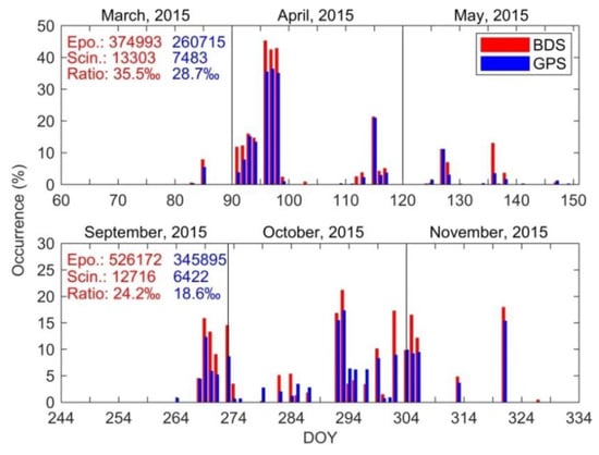 - Liu, K.; Li, G.; Ning, B.; Hu, L.; Li, H. Statistical characteristics of low-latitude ionospheric scintillation over China. Adv. Space Res. 2015, 55, 1356–1365. [Google Scholar] [CrossRef]