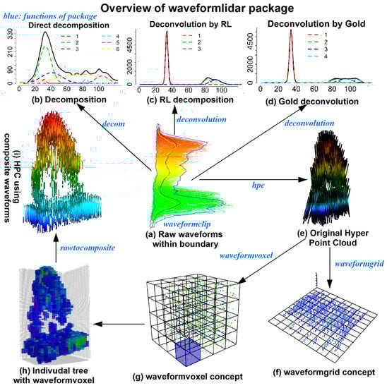 As shown in Table 2, the waveformlidar package consists of three major components—waveform processing, waveform variable extraction and HPC generation and its potential applications. More specifically, we summarized core functions of the package in Figure 1. For example, the decom is used for decomposition, the deconvolution is used for Gold and RL deconvolution, hpc is used for generating the HPC, waveformgrid and waveformvoxel is used for projecting the HPC into 2D and 3D dimensions and rawcomposite is used for generating composite waveforms from the HPC. The core these functions of the package and how to use them are elaborated in the following sections.