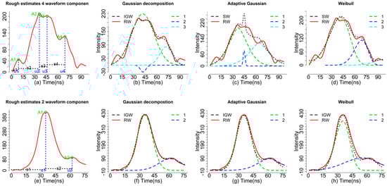 Comparisons of results using different waveform processing methods such as rough estimates the peakfind function (a,e), Gaussian (b,f), Adaptive Gaussian (c,g) and Weibull decompositions (d,h) for two representative waveforms. Black dash is the ideal model (Gaussian, Adaptive Gaussian and Weibull) based waveform (IGW), red solid is the raw waveform (RW). The number such as 1 2 or 3 represents the individual waveform components with different colors.