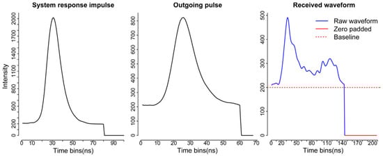 A subset of the system response impulse, a sample of outgoing pulse and corresponding raw waveform recorded by National Ecological Observatory Network’s (NEON) full waveform LiDAR system [].