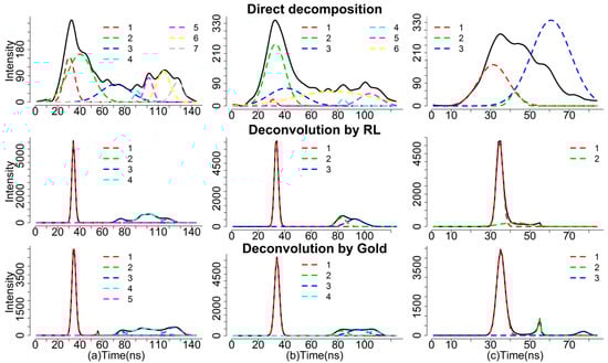 Comparisons of the decomposition results with the direct decomposition approach, Richard-Lucy (RL) approach and Gold approach for three sample pulses (a–c). The solid black line is the original waveform. The colored dash lines are Gaussian components after decomposition [].