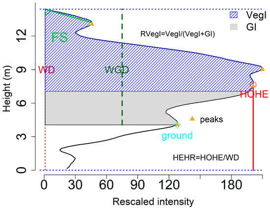 An example of waveform metrics, such as the number of waveform peaks (orange triangle), waveform distance (WD, red dash line), waveform distance from ground (WGD, dark green dash), front slope (FS, green), height of half total energy (HOHE, red line), possible ground location (cyan square), the integral of ground part (GI, gray area), the integral of vegetation part (VegI, blue area) and the ratio of vegetation integral (RVegal) extracting from the waveform.