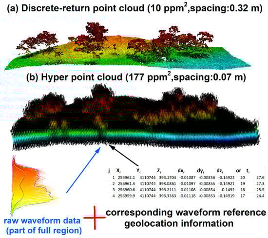 The methods mentioned in Section 3.1.1 are mainly intended to convert part of waveform signals into points to form DR-like point clouds with additional information such as amplitude (A) and echo width (). However, intensity information embedded in waveforms, which is the most conspicuous advantage of FW LiDAR data, is still insufficiently studied. Moreover, the decomposition or deconvolution method requires users to have a deep understanding of complicated waveform processing methods and precludes practitioners’ willingness to explore FW LiDAR data’s potential. To overcome these technical barriers and make the most use of waveform information, we proposed a new concept named Hyper Point Cloud (HPC) to directly convert all waveform information into points with the aid of the geo-reference data []. In addition, this product also renders us a direct way to visualize the FW LiDAR data with existing tools or software mainly oriented toward DR LiDAR data processing.