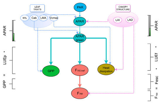 Energy partitioning at the leaf and canopy level representing the processes involved in the photosynthetic light use efficiency model (GPP = APAR x LUEp) and fluorescence light use efficiency model (F760 = APAR *LUEf * Fesc) are represented with solid arrows. Dotted arrows represent the hypothesized relationship between leaf traits, canopy structure and the various processes related to the allocation of energy and transfer of SIF within the canopy. Photosynthetic active radiation (PAR); absorbed (by vegetation) photosynthetic active radiation (APAR); PAR absorbed by chlorophyll a and b molecules (APARgreen), represented as the green bar in the equations on both sides of the figure; gross primary production (GPP); sun-induced fluorescence emitted by all leaves at 760 nm (F760leaf); sun-induced fluorescence at 760 nm observed at top of canopy (F760); nitrogen concentration on a mass basis (N%); chlorophyll a and b on a mass basis (Cab); leaf mass per area (LMA); maximum carboxylation rate (Vcmax); leaf area index (LAI); leaf angle distribution (LAD).