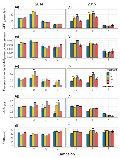 Bar graphs representing differences among treatments (control treatment, C; nitrogen treatment, N; nitrogen and phosphorus treatment, NP; and control treatment, C) of Gross Primary Production (GPP) in 2014 (a) and 2015 (b); light use efficiency of photosynthesis (LUEp) in 2014 (c) and 2015 (d); Fluorescence at 760 nm (F760) in 2014 (e) and 2015 (f); light use efficiency of fluorescence emission at 760 nm (LUEf) in 2014 (g) and 2015 (h); and fraction of F760 that escapes the canopy (Fescfw) in 2014 (i) and 2015 (l). Data are divided among campaigns. Bar graphs represent means and error bars represent 1 standard error. Group differences in (a–h) were analyzed with ANOVA test and individual differences among groups were evaluated with Tukey HSD post hoc test. Group differences in (i,l) were analyzed with ANOVA with the Welch correction and individual differences among groups were evaluated with the Games–Howell post hoc test. “*” refers to a significant difference from the control treatment with p value < 0.05 and “**” refers to a significant difference from the control treatment with p value < 0.01.