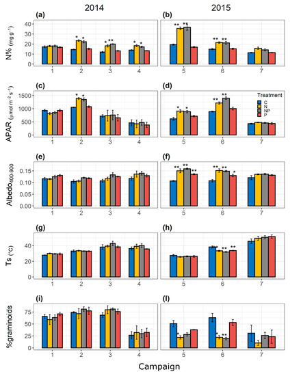 Bar graph representing differences among treatments (control treatment, C; nitrogen treatment, N; nitrogen and phosphorus treatment, NP; and control treatment, C) of Canopy nitrogen content (N%) in 2014 (a) and 2015 (b); absorbed photosynthetic active radiation (APAR) in 2014 (c) and 2015 (d); Albedo400–900 in 2014 (e) and 2015 (f); Surface Temperature (Ts) in 2014 (g) and 2015 (h); and graminoids relative abundance (%graminoids) in 2014 (i) and 2015 (l). Data are divided among campaigns. Bar graphs represent means and error bars represent 1 standard error. Group differences in (e–h) were analyzed with ANOVA test and individual differences among groups were evaluated with Tukey HSD post hoc test. Group differences in (a,b,i,l) were analyzed with ANOVA with the Welch correction and individual differences among groups were evaluated with the Games–Howell post hoc test. “*” refers to a significant difference from the control treatment with p value < 0.05 and “**” refers to a significant difference from the control treatment with p value < 0.01.