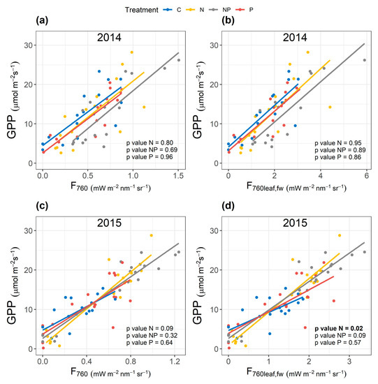 In 2015, the intercept is different for the C treatment for both F760 and F760leaf,fw (p < 0.01 for both) and for the NP treatment with p < 0.05 for both F760 and F760leaf,fw. In 2015, for the N treatment, there is no significant interaction between F760 and treatment (Figure 4c), but there is a significant interaction between F760leaf,fw and the N treatment (p < 0.05) (Figure 4d), with significant differences of the GPP–F760leaf,fw relationship. There is no significant effect of the year on the GPP–F760 relationship. For each treatment, p = 0.706, p = 0.323, p = 0.927 and p = 0.992 for N, P and NP and C, respectively. Instead, when substituting F760 with F760leaf,fw, the effect of the year is not significant in the treatments C and P (p = 0.659 and p=0.742), but is significant for the NP treatment with p < 0.05, and barely not significant for the N treatment with p = 0.057.