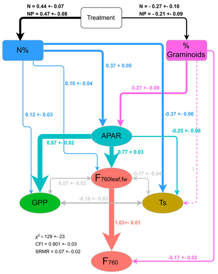 Path analysis displays the role of canopy nitrogen content (Canopy N) and relative graminoids abundance (%graminoids) on the energy partitioning at the leaf and canopy level. Photosynthetic active radiation (PAR); absorbed by vegetation photosynthetic active radiation (APAR); fluorescence emission by all leaves at 760 nm calculated by forward runs of SCOPE (F760leaf,fw); gross primary production (GPP); surface temperature (Ts); and observed fluorescence at 760 nm (F760). The strength of the relationship among variables is expressed by the standardized coefficient (β) of the path analysis. Each standardized coefficient has a standard error obtained from bootstrapping (n = 100 times). The width of the arrows is proportional to their standardized coefficient (β). Colored lines (both solid or dotted) represent direct relationships between variables, whereas gray double-headed arrows represent the covariance among variables. Solid and dotted lines indicate significant (p < 0.05) and non-significant relationships, respectively. The width of the arrows is proportional to their standardized coefficient (β). The different colors are introduced to increase readability of the standardized path coefficients. The fit by the overall model is measured by means of Chi-squared (χ2), comparative fit index (CFI) and standardized root mean square of residual (SRMR).