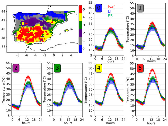 The study area was grouped into six different clusters using the K-Means clustering algorithm (Figure 2). The input data of the K-means were the maximum and minimum LST of the mean diurnal cycle in each pixel in the summer months for the period 2004–2015. The six clusters represent regions with different LST diurnal cycles (Figure 2), although some of the regions show similar diurnal cycles in both reanalyses. Clusters 0 (Northern Iberia) 2 (Central Iberian Plateau) and 4, 5 (Southern semi-arid Iberia) clearly identify different LST diurnal patterns associated with underlying land cover or topography. Clusters 1 and 3 do not clearly identify any land cover or topographical features with a mixture of coastal and inland areas.
