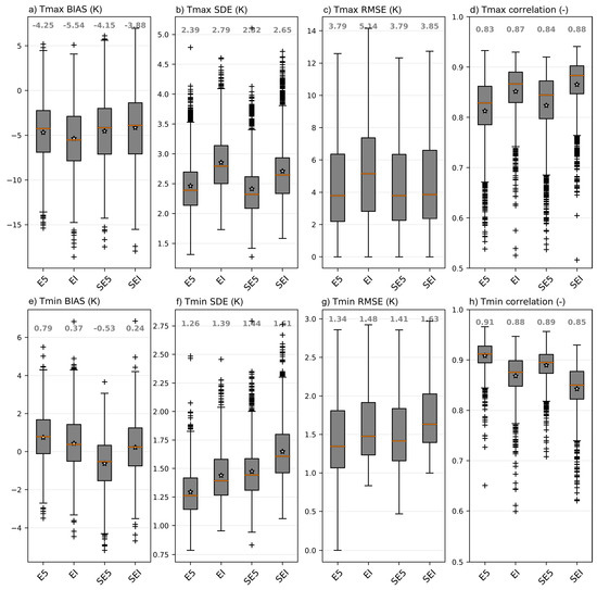 Distributions of LST Tmax (Tmin) mean error (a,e), standard deviation of the error (b,f), root mean square error (c,g) and temporal correlation (d,h) in: ERA5 (E5), ERA-Interim (EI) and the simulations forced with E5 (SE5) and EI (SEI). The red line indicates the median, the filled box represents the interquartile range (25th to 75th percentiles), the whiskers indicate the 10th and 90th percentiles, the white stars the mean, and the cross markers represent outliers. The number above each boxplot is the median of that boxplot. Note the different vertical scales between the Tmax (top) and Tmin (bottom) panels.