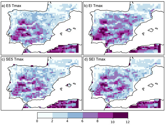In Figure 4 the Tmax RMSE are represented for the whole domain (and in Figure 5 the Tmin RMSE). The zones with higher Tmax RMSE are similar among the four products, comprising the South-West Iberian region and the Northern Iberian Plateau, where the RMSE reaches values above 8 or even 10 K in a vast number of grid points. The Tmin RMSE is overall higher in mountainous regions although the zones with higher RMSE differ in each product.