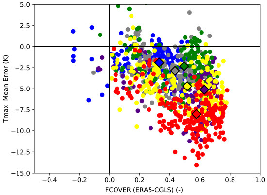 Tmax Mean Error (K) in ERA5 as function of the difference between CGLS-FCover and ERA5 Total Vegetation Cover (TVC). The colors represent the clusters in Figure 2. The diamond marker represents the median value of each cluster.