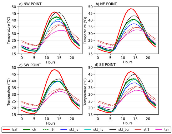 Mean diurnal cycle of temperature (2010 Summer) in the 4 points of the Southern Portugal domain (a) North West, (b) North East, (c) South West (d) South East (see Figure S1) comparing the satellite LST (red), and the LST in the control simulation (green), and control with 9 soil layers (dashed green). The control tile temperatures of low vegetation (blue), high vegetation (cyan) and bare ground (black) are also represented along with the air temperature at 10 m height used to drive the model (magenta) and simulated first soil layer temperature (stl1, brown).