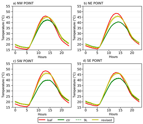 Mean diurnal cycle of temperature (2010 Summer) in the 4 points of the Southern Portugal domain (a) North West, (b) North East, (c) South West (d) South East (see Figure S1) comparing the satellite LST (red), and the LST in the control simulation (green), and control with 9 soil layers (dashed green) with the simulation using ESA-CCI vegetation cover (revised in yellow, and with the 9 soil layers dashed yellow).