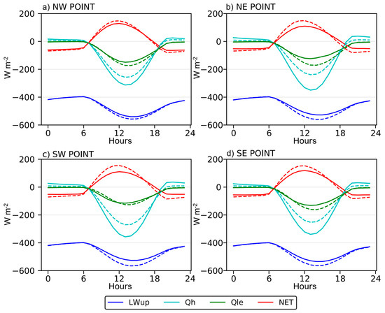 Components of the surface energy balance at the surface in the control (solid lines) and revised (dashed lines) simulations. Longwave upward radiation (LWup, blue), sensible heat flux (Qh, cyan), latent heat flux (Qle, green) and the surface net flux (NET = SWnet + LWnet + Qh + Qle, solid red). The fluxes sign conventions indicate fluxes to the surface as positive and fluxes leaving the surface as negative. The downward and net solar radiation (SWdown, SWnet) and longwave downward radiation (LWdown) are identical in both simulations and are represented in Figure S7. Each panel represents one of the 4 points of the Southern Portugal domain (a) North West, (b) North East, (c) South West (d) South East (see Figure S1)