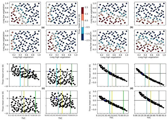 In Figure 10a, the perturbations with lower Tmax errors have very low values in the high vegetation cveg and the perturbations with higher cveg show a consistent underestimation of Tmax, which indicates once more that the original CVH in the model was too high. The low vegetation cveg can take nearly any value since its influence in the LST is reduced due to the low CVL in the original model vegetation. The sensitivity of the cveg parameter for the original CVL and CVH shows no correlation between the TVC and Tmax mean error (Figure 10c), as the same TVC leads to different values of Tmax errors.