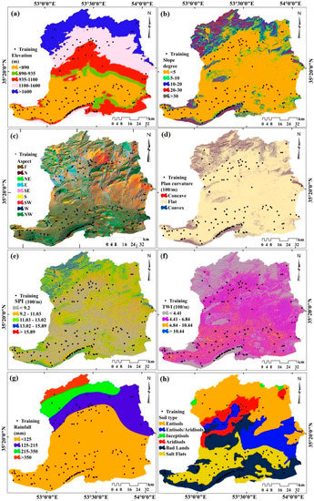 - Zabihi, M.; Mirchooli, F.; Motevalli, A.; Darvishan, A.K.; Pourghasemi, H.R.; Zakeri, M.A.; Sadighi, F. Spatial modelling of gully erosion in Mazandaran Province, northern Iran. Catena 2018, 161, 1–13. [Google Scholar] [CrossRef]