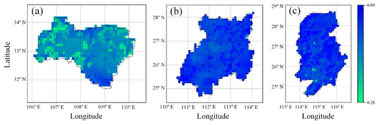 Temporal average values of SMAP root-zone soil wetness (dimensionless) over (a) the Hanjiang River catchment, (b) the Xiangjiang River catchment, and (c) the Ganjiang River catchment.
