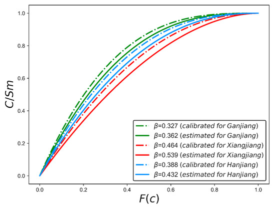 The parameter controls the spatial heterogeneity of soil moisture storage capacity, and it has been commonly calibrated against observed streamflow. We plotted the distributions of soil moisture storage capacity for different values based on the estimation method described in Section 3.3 and the model calibration method. Figure 4 compares the distributions of soil moisture storage capacity of three study catchments. The values of vary at different catchments since the parameter is affected by factors like topography, land cover, and soil texture. Considering the same catchment, two methods produced comparable values. They showed low differences (0.044 for the Hanjiang River Catchment, 0.075 for the Xiangjiang River Catchment, and 0.035 for the Ganjiang River Catchment), which suggests that the prior estimation method proposed in Section 3.3 is reliable.