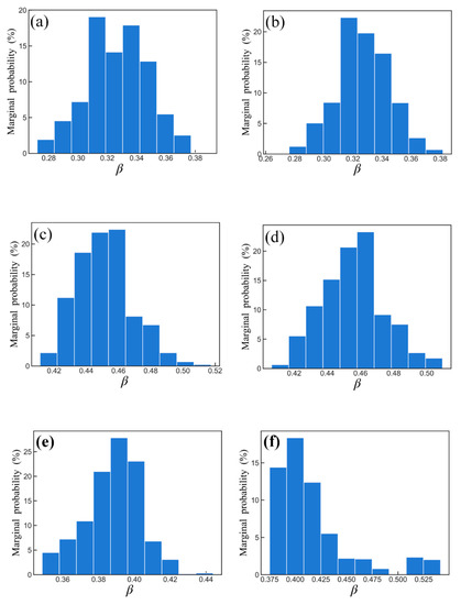 Posterior distributions of β using Hd_0 (left) and Hd_S1 (right) at the Hanjiang River catchment (a,b), the Xiangjiang River catchment (c,d), and the Ganjiang River Catchment (e,f).