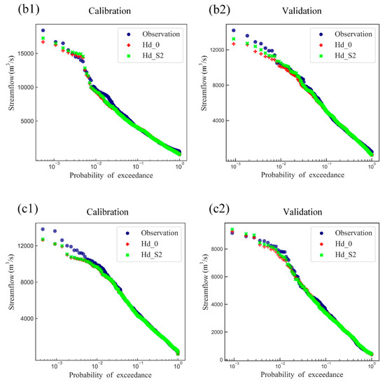 In Figure 8b,c, the Xiangjiang River catchments and the Ganjiang River catchments show an approximate linear FDC, while the Hanjiang River catchment shows a nonlinear curve (Figure 8a). The nonlinear curve in the Hanjiang River Catchment indicates that observed data at calibration and validation periods constitute a disproportional representation of high, medium, and low flow regimes [66]. The nonlinearity in the Hanjiang River catchment may lead to lower simulation performance than the Xiangjiang River catchment. The results of the comparison between Hd_0 and Hd_S2 simulations and observations show that the low flows in both the Hanjiang River catchments and the Xiangjiang River catchments were well captured during calibration and validation periods.