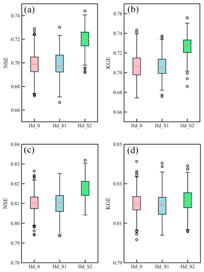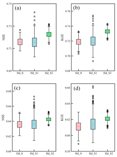 In order to consider the prediction uncertainty of the model setups, boxplots of the NSE and KGE values concerning all 2000 calibrated parameter sets were given in Figure 6. Figure 6 demonstrates a more comprehensive comparison of simulation performances during validation periods, which compared the distribution of the three metrics obtained from Hd_0, Hd_S1, and Hd_S2 at the validation period. For NSE values, Hd_S2 always provided better values. Considering KGE values, Hd_S1 could give a better performance. The explanation for this can be that constraining the value of the parameter could reduce equifinality.