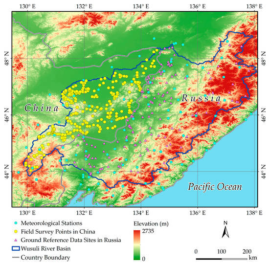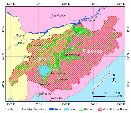 The latitude of this area ranges from 43°25′N to 48°56′N and the longitude ranges from 129°50′E to 138°05′E. The watershed area is about 195.06 × 103 km2 in total, of which the Russian and the Chinese sections account for 69.06% and 30.94%, respectively. According to the administrative boundary, the basin runs from west to east across the Heilongjiang province of China and the Primorsky Krai province of Russia. In terms of the natural landscape, the Chinese section of the Wusuli River Basin is located on the East Sanjiang Plain, and the Russian section is part of the West Sikhot Mountains. The average elevation of this basin is 354 m, and the climate is characterized by a cold and dry winter and a warm and rainy summer.