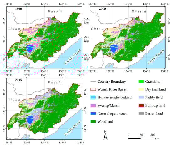 Land cover maps of the Wusuli River Basin in 1990, 2000 and 2015.