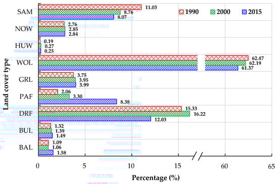 Figure 4 illustrates the spatio-temporal distribution of each land cover type in the study area from 1990 to 2015. The comparisons of the percentage of each land cover type are depicted in Figure 5. Table 5 shows the ALCA and ALCR of each land cover type. The results indicate that the natural wetlands (i.e., swamp/marsh and natural open water) of the Wusuli River Basin experienced a gradual decrease from 13.79% of the total area (26,892.99 km2) in 1990 to 10.91% of the total area (21,267.23 km2) in 2015, with an ALCA of −225.03 km2/y and an ALCR of −0.96%/y. Swamp/marsh decreased by 2.96% during the period 1990–2015, while the area of natural open water increased by 0.08%. From 1990 to 2000, swamp/marsh decreased dramatically, with a change rate of −42.81 km2/y. During 2000–2015, the reduction rate of the swamp/marsh area slowed over time, with an average rate of loss of 90.45 km2/y. Despite an annual reduction area of 85.87 km2, woodland remained the dominant landscape type during the period 1990–2015, with the vast majority distributed in the Russian part of the catchment. Cropland expanded markedly with an average rate of gain of 236.01 km2/y, especially in 1990–2000 with an ALCR of 417.91 km2/y. Specifically, the distribution range of paddy field expanded from sporadic patches in 1990 to large-scale continuous areas in the Chinese section of the basin in 2015, and the area quadrupled. In contrast, dry farmland decreased overall from 15.33% of the total area in 1990 to 12.06% of the total area in 2015, mainly because of a rapid rate of decrease from 2000 to 2015 (ALCR was −545.27 km2/y). Human-made wetland, grassland, built-up land, and barren land had a slight areal increase during the period 1990–2015 with an ALCA of 4.58 km2/y, 18.61 km2/y, 13.72 km2/y, and 38.03 km2/y, respectively.