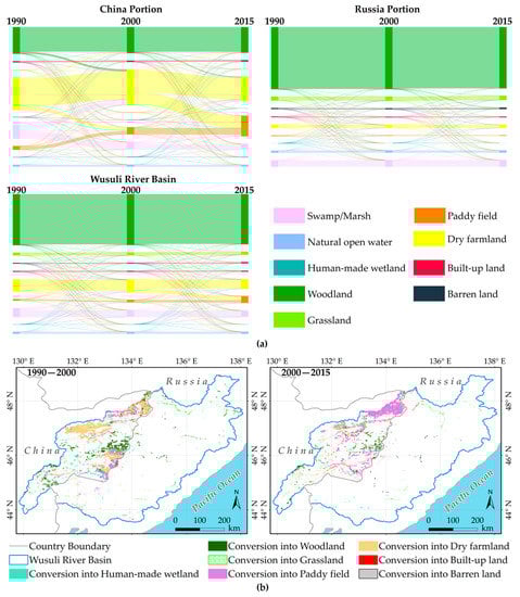 To analyze the spatial change characteristics of natural wetlands (i.e., swamp/marsh and natural open water) more explicitly, intersect overlay analysis in ArcGIS 10 [] was used to create a conversion matrix between natural wetlands and other land cover types for the time periods 1990–2000 and 2000–2015. In addition, a Sankey diagram [] was used to illustrate the conversion of all land cover types, as this can help visualize the temporal dynamics of all land cover types.