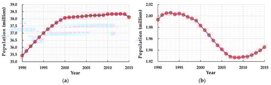 Population change for the Heilongjiang province of China (a) and the Primorsky Krai province of Russia (b) from 1990 to 2015.