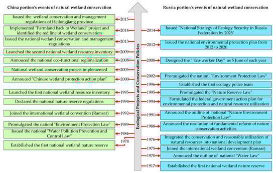 As the eco-environmental values of natural wetlands have become more widely recognized, some ecological projects and conservation policies have been introduced to protect and restore them. Figure 8 illustrates pivotal ecological projects and conservation policies for natural wetland in China and Russia. It was found that the implementation of wetland protection measures in Russia occurred more than 60 years earlier than in China. Russia’s accession to the Ramsar Wetland Convention was 17 years earlier than that of China. Compared with China, earlier environmental protection laws, which included the conservation and rational use of natural wetlands, were promulgated in Russia. All of these differences allow Russia has more prerequisites for wetland protection than China. This probably explains why the natural wetlands in the Russian region of the Wusuli River Basin have gone through a process of gradual restoration and improvement. In the Chinese part of the basin, although natural wetlands have experienced a loss and fragmentation process, the rate of area reduction has decreased over time (Table 5). Since the “Chinese wetland protection action plan” was initiated in 2000, many feasible and effective wetland protection and restoration measures have been implemented successively, which play a substantial role in natural wetland restoration and conservation []. Our results show that, on the one hand, the area of natural wetland reduced by cropland encroachment in 2000–2015 was only 25.56% of that in 1990–2000, on the other hand, the area of natural wetland restored from croplands in 2000–2015 was 1.25 times that in 1990–2000 in Chinese part of Wusuli River Basin (Table 5). Therefore, it can be inferred that, due to the implementation of conservation policies and measures, the destruction and disturbance caused by human activities to natural wetland has been mitigated to some degree in the Chinese region of the basin.