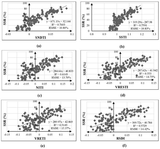 Figure 4. Correlation between Landsat-8-based tillage indices and soil surface residue (SSR). (a) Normalized difference tillage index (NDTI), (b) Simple tillage index (STI), (c) normalized difference index 7 (NDI7), (d) Normalized difference index 5 (NDI5), (e) Shortwave red normalized difference index (SRNDI), and (f) Modified crop residue cover (MCRC).