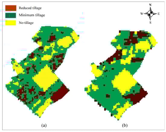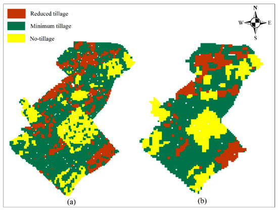 As previously mentioned in Section 3, the accuracy of classification for each individual class was obtained using user and producer accuracies. It was observed that among the three classes (reduced tillage, minimum tillage, and no-tillage), the highest classification accuracy was assigned to the no-tillage class. It was due to the accumulation of the residue in the local objects that classified as no tillage (SSR more than 60%). In this context, the light and yellowish color of the residue well distinguished them from the soil and increased classification accuracy. In terms of accuracies, reduced tillage was the second class to meet study objectives. In this way, the main part of the assigned objects’ class included the dark and brownish color of the soil that distinguished them from the other objects. In this study, minimum tillage class (SSR between 30%–60%) also obtained lowest producer and user accuracies from both Landsat-8 and Sentinel-2A data. The objects assigned to this class were mainly a uniform mixture of residue and soil. It was clearly due to an overlapping problem of spectral boundaries from reduced tillage and no-tillage classes into this class.