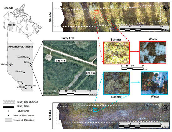 Experiments took place at two sites in the boreal forest south of Conklin Alberta, which we refer to as site 464 and site 466. Both are short (~25 m) segments of seismic lines (petroleum-exploration corridors) containing regenerating seedlings. Imagery over the sites was obtained in both leaf-on (‘summer’) and leaf-off (‘winter’) conditions.