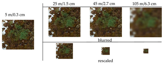 Our data set consisted of images taken at 5 m flying altitude, resulting in a ground sampling distance of 0.3 cm. To emulate the effect of flying at higher altitudes yielding larger ground sampling distances, we artificially blurred and downscaled the images in several stages and examined the detection rate based on the changed ground sampling distance. To emulate different flying altitudes, images were blurred using a Gaussian filter with a standard deviation of σ = 1/s and then averaged over s × s windows where s is the desired scale ratio. This process approximates images shot at an increased flying altitude but does not consider the alteration of perspective. We conducted experiments with s ∈ {5, 9, 21}, which resulted in images simulated from 25 m, 45 m, and 105m altitude, or 1.5 cm, 2.7 cm, and 6.3 cm ground sampling distance respectively (Figure 2).