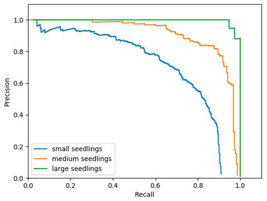 Precision–recall curves from faster R-CNN for small, medium, and large seedlings.