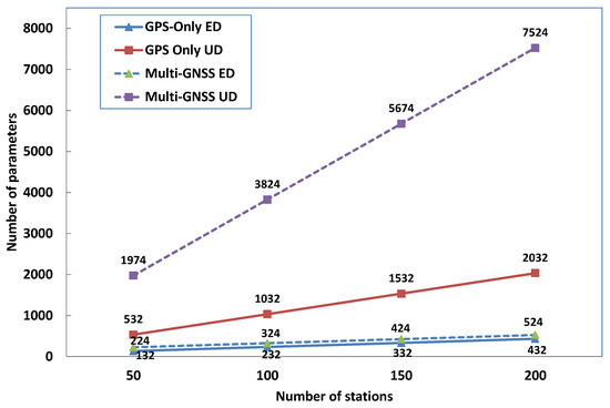 To get an intuitive impression on the comparison of the number of unknowns, Figure 1 illustrates the varying total number of parameters along with the number of stations n s t a . Let us take n s t a = 100 as an example, the total number of unknowns is 232, 324, 1032, 3824 for ED of GPS-only, ED of multi-GNSS, UD of GPS-only, and UD of multi-GNSS, respectively. It is concluded that the inclusion of the new satellite systems implies a significant increase in computation load for the UD model, whereas this dilemma can be mitigated by using the ED model.