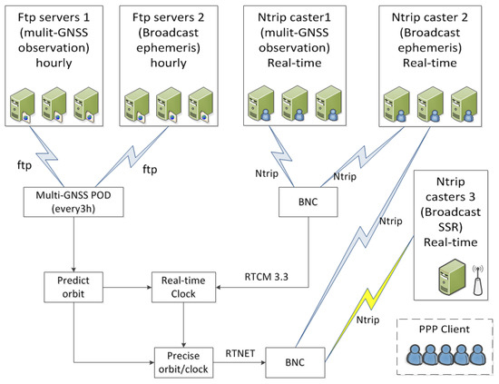 The BKG Ntrip Client (BNC) software (version 2.12) [32] is used to receive real-time observations as well as ephemeris data to feed the filter for clock estimation, and is also used to generate state-space representation corrections from the estimated orbits and clocks. Real-time data are transported using the NTRIP protocol and encoded/decoded following the RTCM 3.3 standard [11]. The structure of all systems is shown in Figure 4.