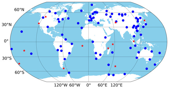 A network of about 110 global multi-GNSS stations is employed in the experiment. All the 110 stations can track GPS signals, while 105, 65, and 83 stations are with GLONASS, Galileo, and BeiDou tracking capacity, respectively. Most of the real-time observation streams are provided by the International GNSS Service (IGS) and the Multi-GNSS Experiment (MGEX). German Geoscience Research Center (GFZ) and the German Federal Agency for Cartography and Geodesy (BKG) also contributed some multi-GNSS stations. The distribution of the stations is shown in Figure 5. The circle marks are the 110 stations used for clock estimation, while the stars indicate the 12 stations used for real-time PPP test in Section 5.3, which are not included in clock estimation. Because of the network or other reasons, real-time streams are not as stable as the recorded observation files. Normally there are at least 90 stations available for clock estimation.